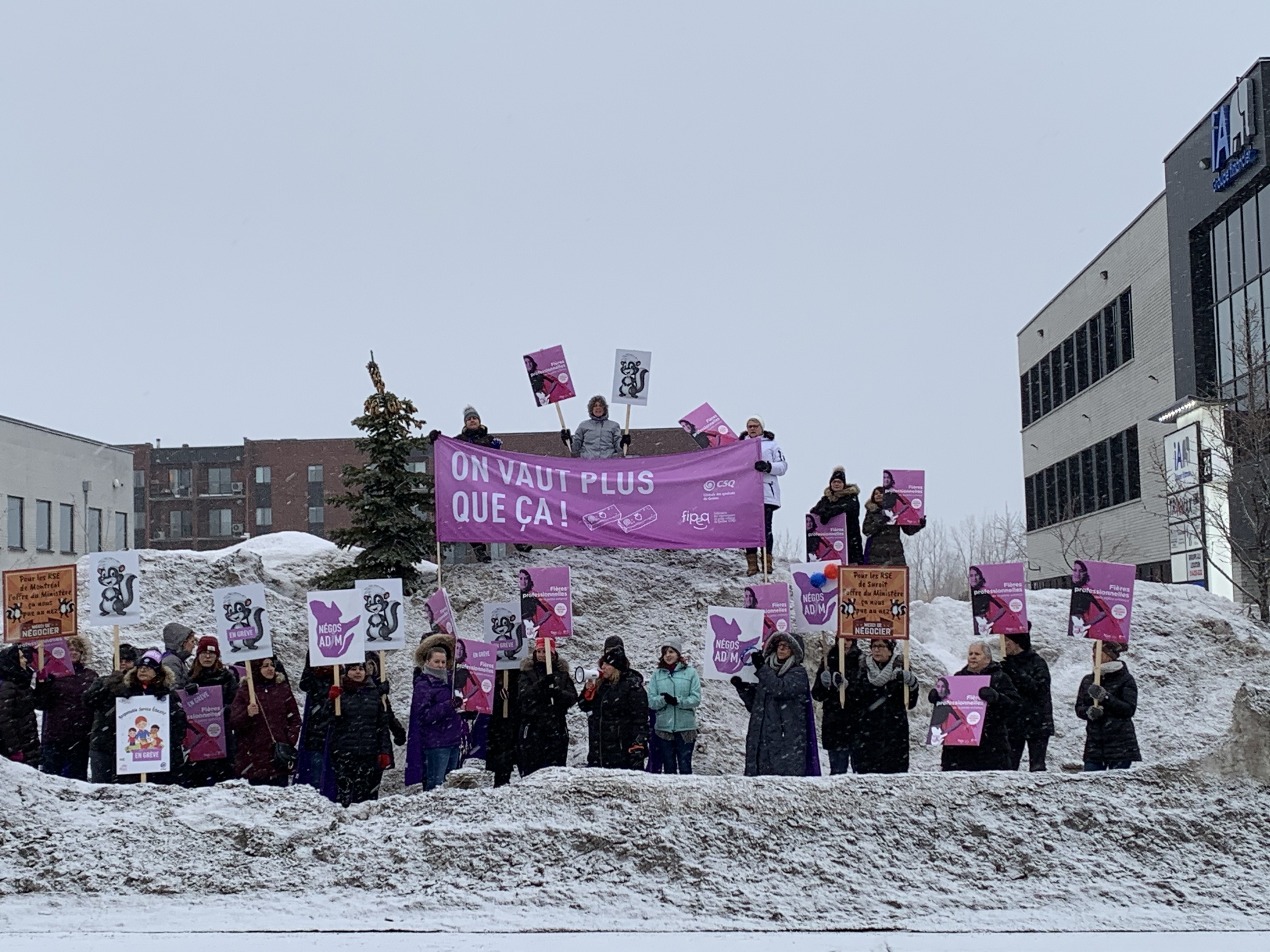 Parallèlement à cette manifestation, environ 60 000 familles étaient touchées par une 6e semaine de débrayages progressifs les vendredis. Aujourd’hui, l’ouverture des milieux familiaux régis et subventionnés était retardée de 1h30. La FIPEQ-CSQ poursuivra ce mandat pour 1h45 le 13 mars et 2h le 20 mars. Elle a toujours en main une demi-journée et une journée complète qu’elle peut déployer au moment jugé opportun.