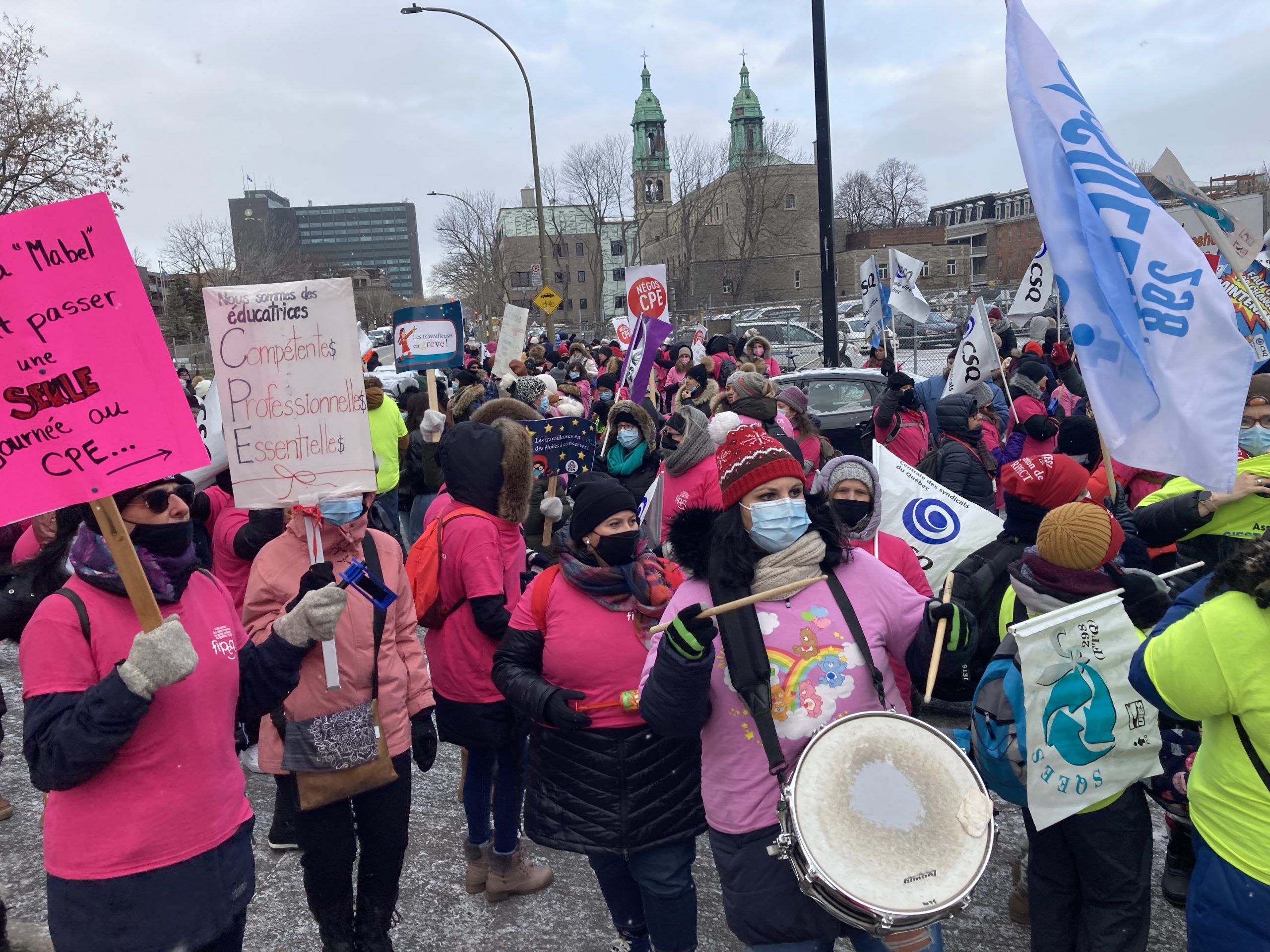 Des centaines de salariées en CPE ont manifesté ce matin devant les bureaux du ministère de la Famille (MF) à Montréal et devant ceux du Conseil du trésor à Québec afin de réclamer de prioriser le personnel avant les projets d’infrastructures. « C’est bien beau vouloir développer 37 000 places en CPE, mais les offres gouvernementales ne permettront tout simplement pas de retenir le personnel en place et d’attirer la relève. Ça va prendre du monde et pour cela, toutes les énergies du gouvernement devraient être déployées pour obtenir un règlement satisfaisant », estime Madame Grenon.